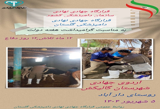 اردوی یک روزه ی جهادی که در تاریخ ۵ شهریور ۱۴۰۴ به همت همکاران اداره دامپزشکی شهرستان گالیکش جهت ارائه خدمات رایگان دامپزشکی در روستای دارآباد این شهرستان برگزار شد که شرح خدمات به شرح زیر می باشد. واکسیناسیون ۶۰ راس گاو و گوساله و ۱۰۰۰ راس گوسفند و بز علیه بیماری تب برفکی  واکسیناسیون ۶۰ قلاده سگ علیه بیماری هاری سمپاشی ۲۰۰۰ متر مربع جایگاه نگهداری دام علیه انگلهای خارجی ( کک و کنه و حشرات ) صورت گرفت.