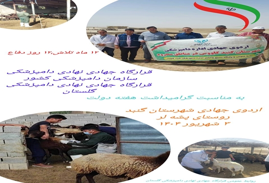 اردوی یک روزه ی جهادی که در تاریخ ۳ شهریور ۱۴۰۴ به همت همکاران اداره دامپزشکی شهرستان گنبد جهت ارائه خدمات رایگان دامپزشکی در روستای پشه لر این شهرستان برگزار شد که شرح خدمات ارائه شده بدین صورت می باشد: واکسیناسیون تب برفکی ۴۰۰۰ راس گوسفند و بز